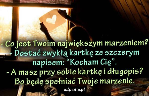 – Co jest Twoim największym marzeniem? – dostać zwykłą kartkę ze szczerym napisem: kocham Cię. – a masz przy sobie kartkę i długopis? bo będę spełniać Twoje marzenie