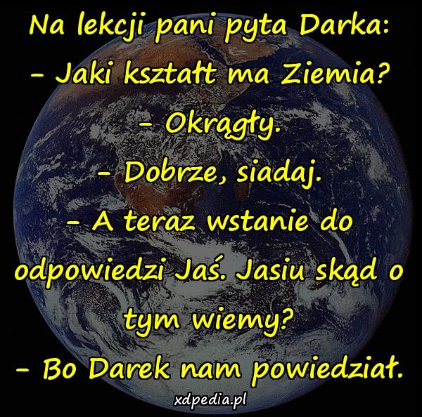 Na lekcji pani pyta Darka: – Jaki kształt ma Ziemia? – Okrągły. – Dobrze, siadaj. – A teraz wstanie do odpowiedzi Jaś. Jasiu skąd o tym wiemy? – Bo Darek nam powiedział.