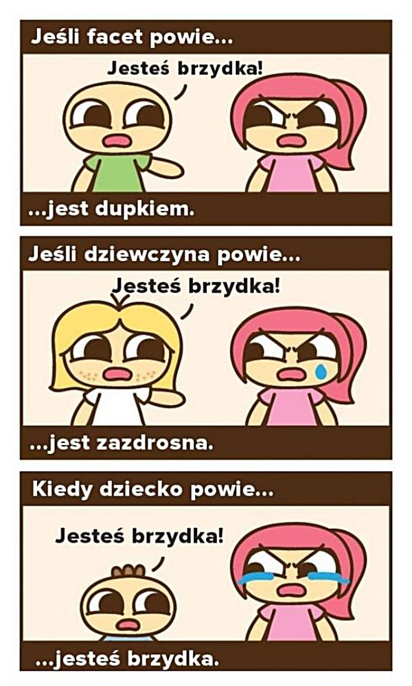 Jeśli facet powie: jesteś brzydka. Jest dupkiem. Jeśli dziewczyna powie: jesteś brzydka. Jest zazdrosna. Jeśli dziecko powie: jesteś brzydka. Jesteś brzydka.