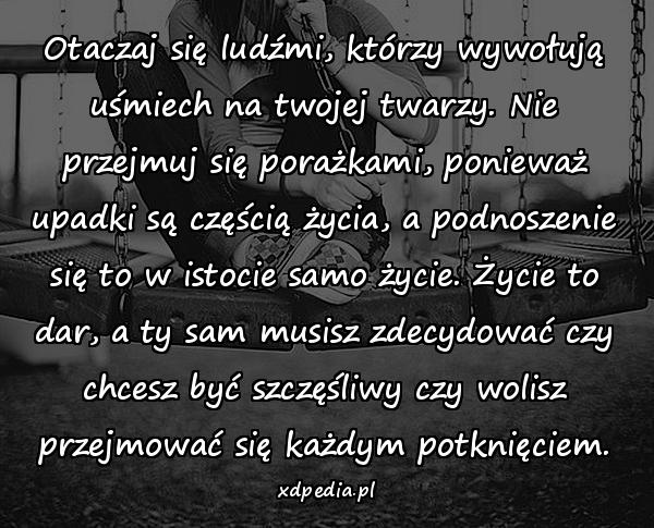 Otaczaj się ludźmi, którzy wywołują uśmiech na twojej twarzy. Nie przejmuj się porażkami, ponieważ upadki są częścią życia, a podnoszenie się to w istocie samo życie. Życie to dar, a ty sam musisz zdecydować czy chcesz być szczęśliwy czy wolisz przejmować się każdym potknięciem.