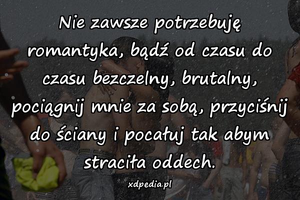 Nie zawsze potrzebuję romantyka, bądź od czasu do czasu bezczelny, brutalny, pociągnij mnie za sobą, przyciśnij do ściany i pocałuj tak abym straciła oddech.