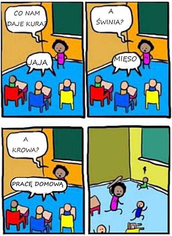 – Co nam daje kura? – Jaja. – Co nam daje świnia? – Mięso – A krowa – Pracę domową