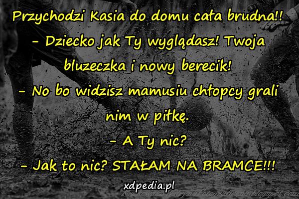 Przychodzi Kasia do domu cała brudna!! – Dziecko jak Ty wyglądasz! Twoja bluzeczka i nowy berecik! – No bo widzisz mamusiu chłopcy grali nim w piłkę. – A Ty nic? – Jak to nic? STAŁAM NA BRAMCE!!!