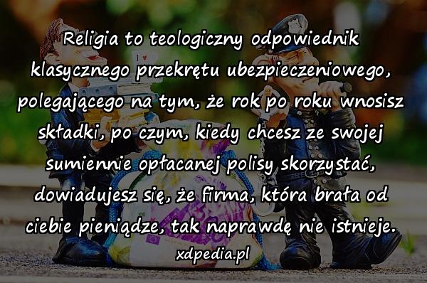 Religia to teologiczny odpowiednik klasycznego przekrętu ubezpieczeniowego, polegającego na tym, że rok po roku wnosisz składki, po czym, kiedy chcesz ze swojej sumiennie opłacanej polisy skorzystać, dowiadujesz się, że firma, która brała od ciebie pieniądze, tak naprawdę nie istnieje.