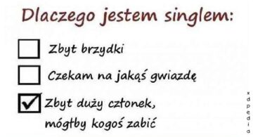 Dlaczego jestem singlem: – zbyt brzydki – czekam na jakąś gwiazdę – zbyt duży członek, mógłby kogoś zabić