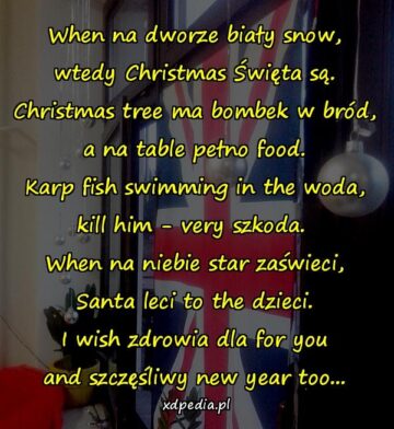 When na dworze biały snow, wtedy Christmas Święta są. Christmas tree ma bombek w bród, a na table pełno food. Karp fish swimming in the...