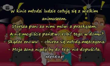 W kinie młodzi ludzie całują się z wielkim animuszem. Starsza pani za nimi mówi z przekąsem: – A nie mogliście państwo robić tego w domu?...