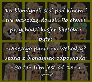 16 blondynek stoi pod kinem i nie wchodzą do sali. Po chwili przychodzi kasjer biletów i pyta: -Dlaczego panie nie wchodzą? Jedna z blondynek odpowiada:...