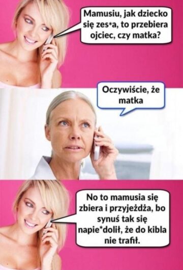 – Mamusiu, jak dziecko się zesra, to przebiera ojciec, czy matka? – Oczywiście, ze natka – No to mamusia się zbiera i przyjeżdża, bo synuś...