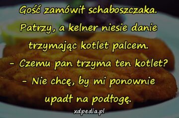 Gość zamówił schaboszczaka. Patrzy, a kelner niesie danie trzymając kotlet palcem. – Czemu pan trzyma ten kotlet? – Nie chcę, by mi ponownie upadł na...