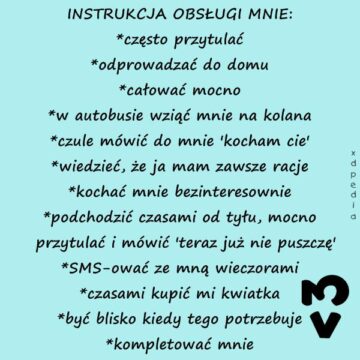 INSTRUKCJA OBSŁUGI MNIE: *często przytulać *odprowadzać do domu *całować mocno *w autobusie wziąć mnie na kolana *czule mówić do mnie: kocham Cię *wiedzieć, że ja...