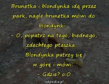 Brunetka i blondynka idą przez park, nagle brunetka mówi do blondynki: – O, popatrz na tego, biednego, zdechłego ptaszka… Blondynka patrzy się w górę i...