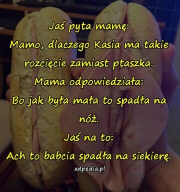 Jaś pyta mamę: Mamo, dlaczego Kasia ma takie rozcięcie zamiast ptaszka. Mama odpowiedziała: Bo jak była mała to spadła na nóż. Jaś na to: Ach...