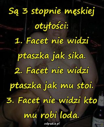 Są 3 stopnie męskiej otyłości: 1. Facet nie widzi ptaszka jak sika. 2. Facet nie widzi ptaszka jak mu stoi. 3. Facet nie widzi kto...