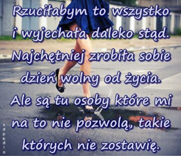 Rzuciłabym to wszystko i wyjechała daleko stąd. Najchętniej zrobiła sobie dzień wolny od życia. Ale są tu osoby które mi na to nie pozwolą, takie...