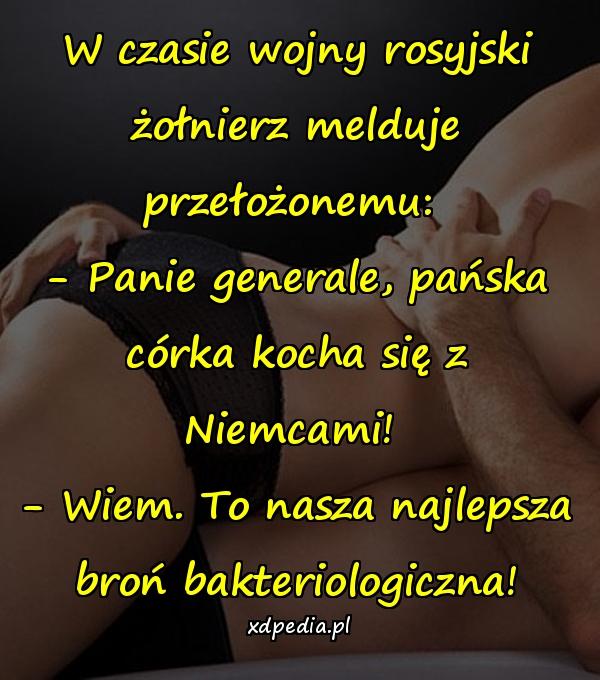 W czasie wojny rosyjski żołnierz melduje przełożonemu: – Panie generale, pańska córka kocha się z Niemcami! – Wiem. To nasza najlepsza broń bakteriologiczna!