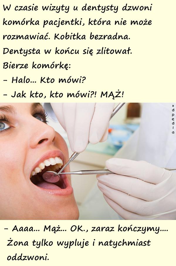 W czasie wizyty u dentysty dzwoni komórka pacjentki, która nie może rozmawiać. Kobitka bezradna. Dentysta w końcu się zlitował. Bierze komórkę: – Halo… Kto mówi? – Jak kto, kto mówi?! MĄŻ! – Aaaa… Mąż… OK., zaraz kończymy…. Żona tylko wypluje i natychmiast oddzwoni.
